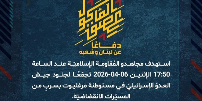 دفاعًا عن لبنان وشعبه، استهدف مجاهدو المُقاومة الإسلاميّة عند الساعة 17:50 الإثنين 06-04-2026 تجمّعًا لجنود جيش العدوّ الإسرائيليّ في مستوطنة مرغليوت بسربٍ من المسيّرات الانقضاضيّة.