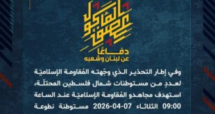 دفاعًا عن لبنان وشعبه، استهدف مجاهدو المُقاومة الإسلاميّة عند الساعة 18:15 الإثنين 06-04-2026 تجمّعًا لجنود جيش العدوّ الإسرائيليّ في مستوطنة كريات شمونة للمرّة الثانية بسربٍ من المسيّرات الانقضاضيّة.