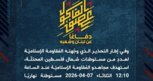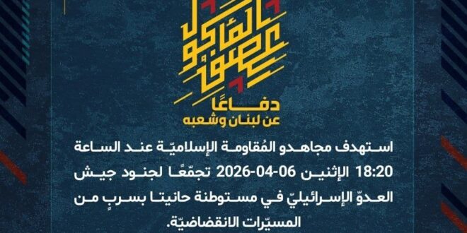 دفاعًا عن لبنان وشعبه، استهدف مجاهدو المُقاومة الإسلاميّة عند الساعة 18:20 الإثنين 06-04-2026 تجمّعًا لجنود جيش العدوّ الإسرائيليّ في مستوطنة حانيتا بسربٍ من المسيّرات الانقضاضيّة.