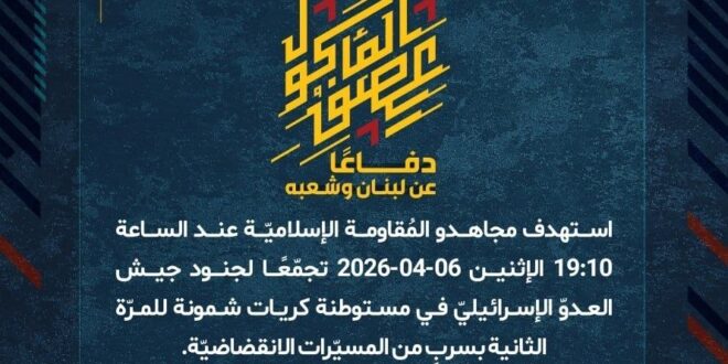 دفاعًا عن لبنان وشعبه، استهدف مجاهدو المُقاومة الإسلاميّة عند الساعة 19:10 الإثنين 06-04-2026 تجمّعًا لجنود جيش العدوّ الإسرائيليّ في مستوطنة كريات شمونة للمرّة الثانية بسربٍ من المسيّرات الانقضاضيّة.