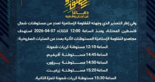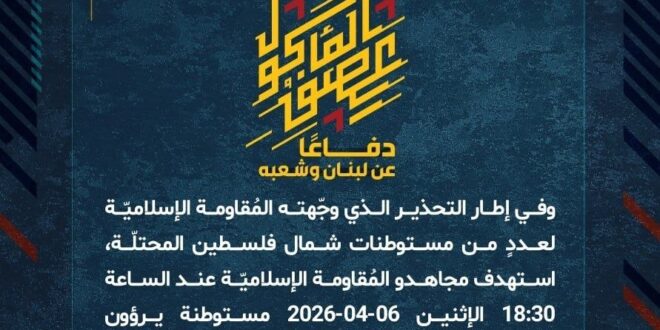 دفاعًا عن لبنان وشعبه، وفي إطار التحذير الذي وجّهته المُقاومة الإسلاميّة لعددٍ من مستوطنات شمال فلسطين المحتلّة، استهدف مجاهدو المُقاومة الإسلاميّة عند الساعة 18:30 الإثنين 06-04-2026 مستوطنة يرؤون بصلية صاروخيّة.