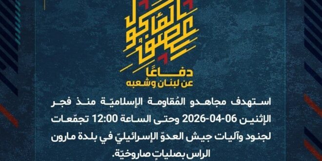 دفاعًا عن لبنان وشعبه، استهدف مجاهدو المُقاومة الإسلاميّة منذ فجر الإثنين 06-04-2026 وحتى الساعة 12:00 تجمّعات لجنود وآليات جيش العدوّ الإسرائيليّ في بلدة مارون الراس بصلياتٍ صاروخيّة.
