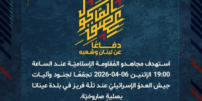 دفاعًا عن لبنان وشعبه، استهدف مجاهدو المُقاومة الإسلاميّة عند الساعة 19:00 الإثنين 06-04-2026 تجمّعًا لجنود وآليات جيش العدوّ الإسرائيليّ عند تلّة فريز في بلدة عيناتا بصليةٍ صاروخيّة.