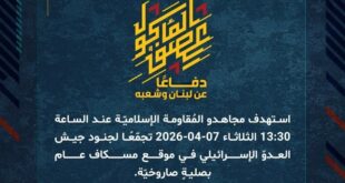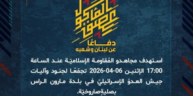 دفاعًا عن لبنان وشعبه، استهدف مجاهدو المُقاومة الإسلاميّة عند الساعة 17:00 الإثنين 06-04-2026 تجمّعًا لجنود وآليات جيش العدوّ الإسرائيليّ في بلدة مارون الراس بصليةٍ صاروخيّة.