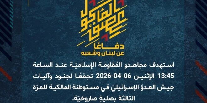 دفاعًا عن لبنان وشعبه، استهدف مجاهدو المُقاومة الإسلاميّة عند الساعة 13:45 الإثنين 06-04-2026 تجمّعًا لجنود وآليات جيش العدوّ الإسرائيليّ في مستوطنة المالكية للمرّة الثالثة بصليةٍ صاروخيّة.