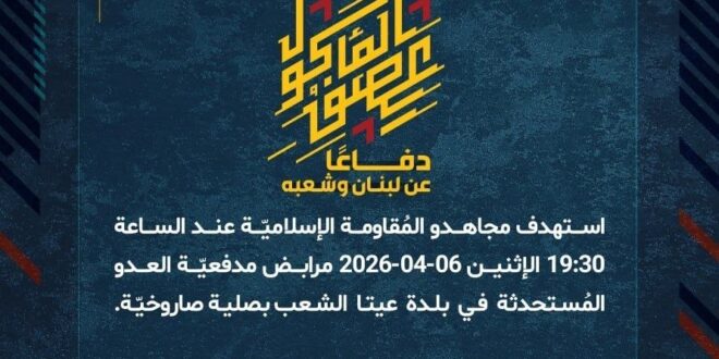 دفاعًا عن لبنان وشعبه، استهدف مجاهدو المُقاومة الإسلاميّة عند الساعة 19:30 الإثنين 06-04-2026 مرابض مدفعيّة العدو المُستحدثة في بلدة عيتا الشعب بصلية صاروخيّة.