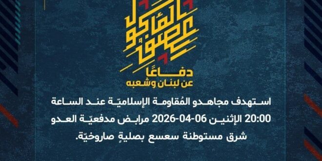 دفاعًا عن لبنان وشعبه، استهدف مجاهدو المُقاومة الإسلاميّة عند الساعة 20:00 الإثنين 06-04-2026 مرابض مدفعيّة العدو شرق مستوطنة سعسع بصلية صاروخيّة.
