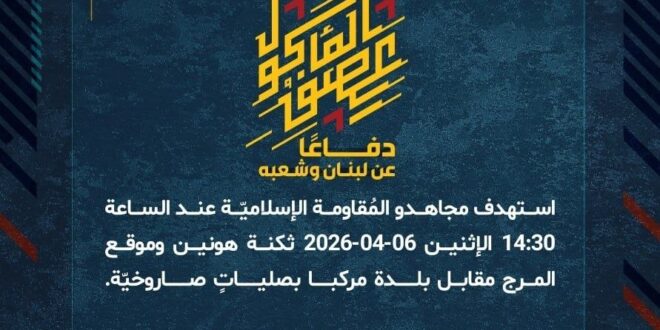 دفاعًا عن لبنان وشعبه، استهدف مجاهدو المُقاومة الإسلاميّة عند الساعة 14:30 الإثنين 06-04-2026 ثكنة هونين وموقع المرج مقابل بلدة مركبا بصلياتٍ صاروخيّة.