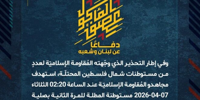 دفاعًا عن لبنان وشعبه، وفي إطار التحذير الذي وجّهته المُقاومة الإسلاميّة لعددٍ من مستوطنات شمال فلسطين المحتلّة، استهدف مجاهدو المُقاومة الإسلاميّة عند الساعة 02:20 الثلاثاء 07-04-2026 مستوطنة المطلة للمرة الثانية بصلية صاروخيّة.