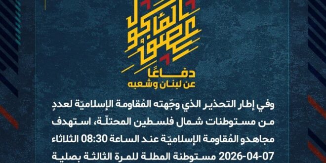 دفاعًا عن لبنان وشعبه، وفي إطار التحذير الذي وجّهته المُقاومة الإسلاميّة لعددٍ من مستوطنات شمال فلسطين المحتلّة، استهدف مجاهدو المُقاومة الإسلاميّة عند الساعة 08:30 الثلاثاء 07-04-2026 مستوطنة المطلة للمرة الثالثة بصلية صاروخيّة.