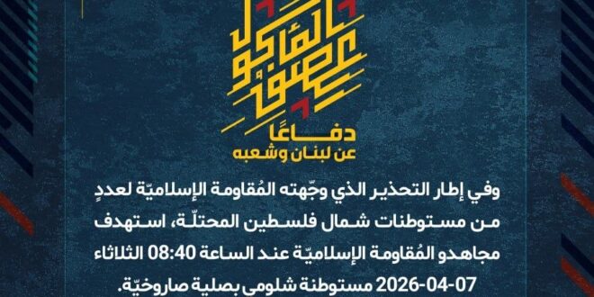 دفاعًا عن لبنان وشعبه، وفي إطار التحذير الذي وجّهته المُقاومة الإسلاميّة لعددٍ من مستوطنات شمال فلسطين المحتلّة، استهدف مجاهدو المُقاومة الإسلاميّة عند الساعة 08:40 الثلاثاء 07-04-2026 مستوطنة شلومي بصلية صاروخيّة.