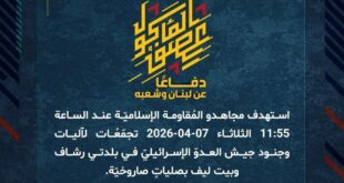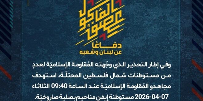 دفاعًا عن لبنان وشعبه، وفي إطار التحذير الذي وجّهته المُقاومة الإسلاميّة لعددٍ من مستوطنات شمال فلسطين المحتلّة، استهدف مجاهدو المُقاومة الإسلاميّة عند الساعة 09:40 الثلاثاء 07-04-2026 مستوطنة إيفن مناحيم بصلية صاروخيّة.