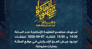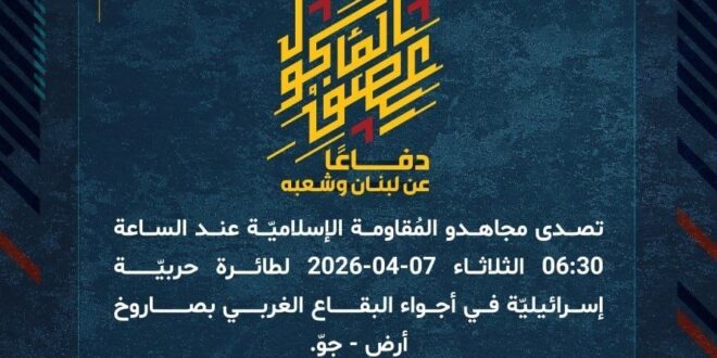 دفاعًا عن لبنان وشعبه، تصدى مجاهدو المُقاومة الإسلاميّة عند الساعة 06:30 الثلاثاء 07-04-2026 لطائرة حربيّة إسرائيليّة في أجواء البقاع الغربي بصاروخ أرض – جوّ.
