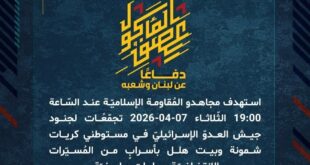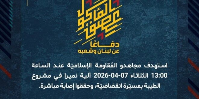 دفاعًا عن لبنان وشعبه، استهدف مجاهدو المُقاومة الإسلاميّة عند الساعة 13:00 الثلاثاء 07-04-2026 آلية نميرا في مشروع الطيبة بمسيّرة انقضاضيّة، وحققوا إصابة مباشرة.