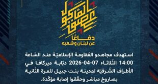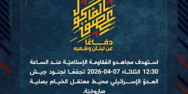 دفاعًا عن لبنان وشعبه، استهدف مجاهدو المُقاومة الإسلاميّة عند الساعة 12:30 الثلاثاء 07-04-2026 تجمّعًا لجنود جيش العدوّ الإسرائيلي محيط معتقل الخيام بصلية صاروخيّة.