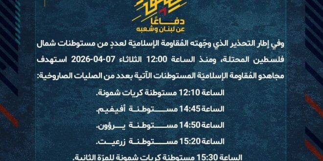 دفاعًا عن لبنان وشعبه، وفي إطار التحذير الذي وجّهته المُقاومة الإسلاميّة لعددٍ من مستوطنات شمال فلسطين المحتلة، ومنذ الساعة 12:00 الثلاثاء 07-04-2026 استهدف مجاهدو المُقاومة الإسلاميّة المستوطنات الآتية بعدد من الصليات الصاروخية: