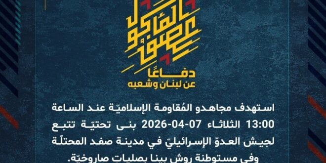 دفاعًا عن لبنان وشعبه، استهدف مجاهدو المُقاومة الإسلاميّة عند الساعة 13:00 الثلاثاء 07-04-2026 بنى تحتيّة تتبع لجيش العدوّ الإسرائيليّ في مدينة صفد المحتلّة وفي مستوطنة روش بينا بصلياتٍ صاروخيّة.