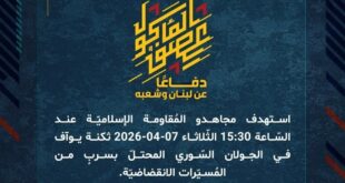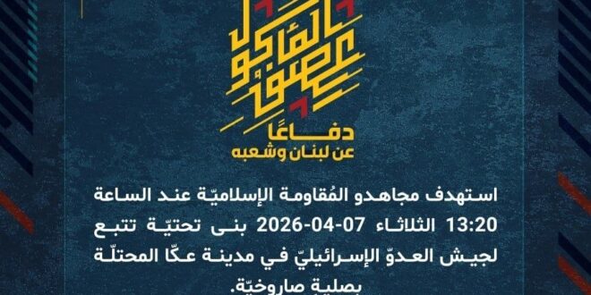دفاعًا عن لبنان وشعبه، استهدف مجاهدو المُقاومة الإسلاميّة عند الساعة 13:20 الثلاثاء 07-04-2026 بنى تحتيّة تتبع لجيش العدوّ الإسرائيليّ في مدينة عكّا المحتلّة بصليةٍ صاروخيّة.