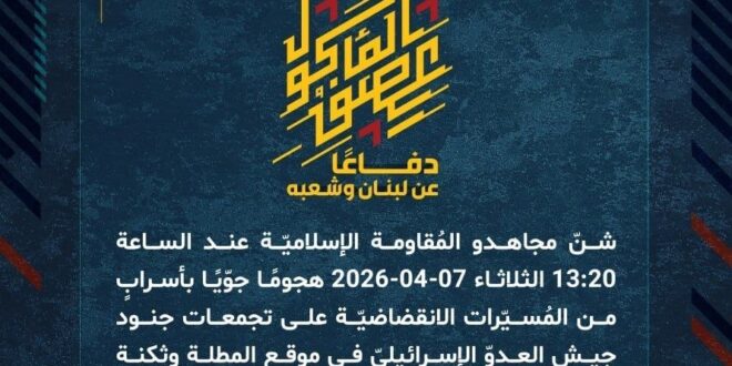 دفاعًا عن لبنان وشعبه، شنّ مجاهدو المُقاومة الإسلاميّة عند الساعة 13:20 الثلاثاء 07-04-2026 هجومًا جوّيًا بأسرابٍ من المُسيّرات الانقضاضيّة على تجمعات جنود جيش العدوّ الإسرائيليّ في موقع المطلة وثكنة يفتاح.