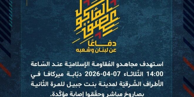 دفاعًا عن لبنان وشعبه، استهدف مجاهدو المُقاومة الإسلاميّة عند السّاعة 14:00 الثّلاثاء 07-04-2026 دبّابة ميركافا في الأطراف الشّرقيّة لمدينة بنت جبيل للمرة الثّانية بصاروخ مباشر وحقّقوا إصابة مؤكّدة.