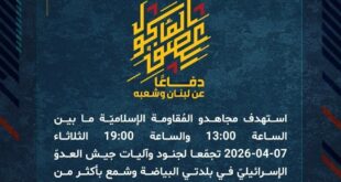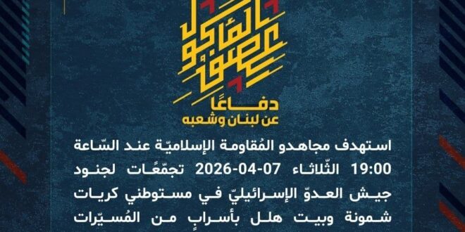 دفاعًا عن لبنان وشعبه، استهدف مجاهدو المُقاومة الإسلاميّة عند السّاعة 19:00 الثّلاثاء 07-04-2026 تجمّعًات لجنود جيش العدوّ الإسرائيليّ في مستوطني كريات شمونة وبيت هلل بأسرابٍ من المُسيّرات الانقضاضيّة وصليات صاروخيّة.