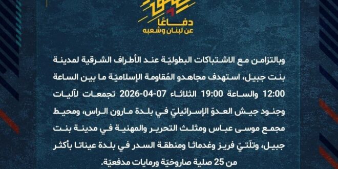 دفاعًا عن لبنان وشعبه، وبالتزامن مع الاشتباكات البطوليّة عند الأطراف الشرقية لمدينة بنت جبيل، استهدف مجاهدو المُقاومة الإسلاميّة ما بين الساعة 12:00 والساعة 19:00 الثلاثاء 07-04-2026 تجمعات لآليات وجنود جيش العدوّ الإسرائيليّ في بلدة مارون الراس، ومحيط مجمع موسى عباس ومثلث التحرير والمهنية في مدينة بنت جبيل، وتلّتيّ فريز وغدماثا ومنطقة السدر في بلدة عيناتا بأكثر من 25 صلية صاروخيّة ورمايات مدفعيّة.