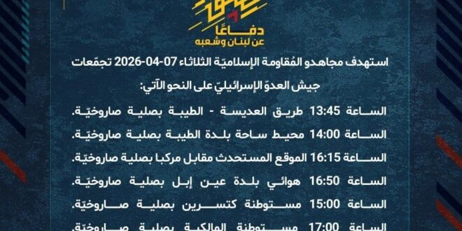 دفاعًا عن لبنان وشعبه، استهدف مجاهدو المُقاومة الإسلاميّة الثلاثاء 07-04-2026 تجمّعات جيش العدوّ الإسرائيليّ على النحو الآتي: