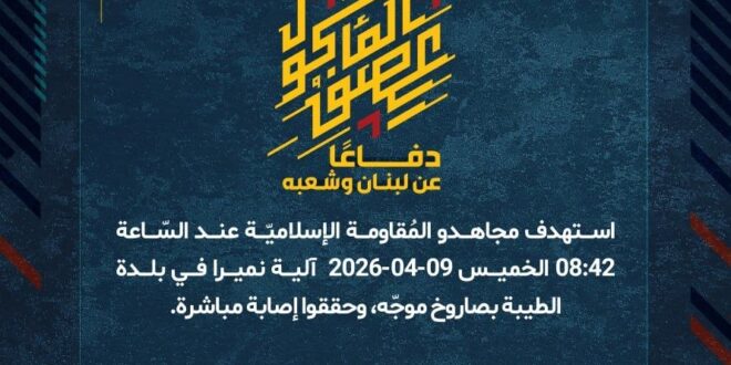 دفاعًا عن لبنان وشعبه، استهدف مجاهدو المُقاومة الإسلاميّة عند السّاعة 08:42 الخميس 09-04-2026 آلية نميرا في بلدة الطيبة بصاروخ موجّه، وحققوا إصابة مباشرة.