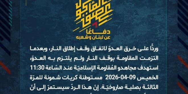 دفاعًا عن لبنان وشعبه، وردًّا على خرق العدوّ لاتفاق وقف إطلاق النار، وبعدما التزمت المقاومة بوقف النار ولم يلتزم به العدوّ، استهدف مجاهدو المُقاومة الإسلاميّة عند السّاعة 11:30 الخميس 09-04-2026 مستوطنة كريات شمونة للمرّة الثالثة بصلية صاروخيّة.
