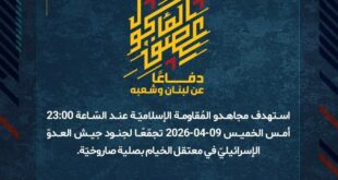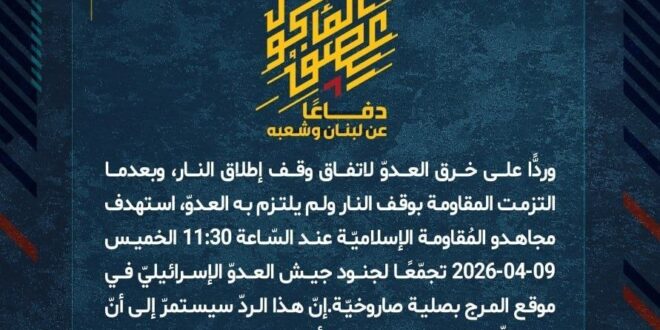 دفاعًا عن لبنان وشعبه، وردًّا على خرق العدوّ لاتفاق وقف إطلاق النار، وبعدما التزمت المقاومة بوقف النار ولم يلتزم به العدوّ، استهدف مجاهدو المُقاومة الإسلاميّة عند السّاعة 11:30 الخميس 09-04-2026 تجمّعًا لجنود جيش العدوّ الإسرائيليّ في موقع المرج بصلية صاروخيّة.