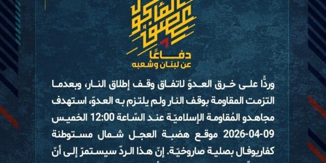 دفاعًا عن لبنان وشعبه، وردًّا على خرق العدوّ لاتفاق وقف إطلاق النار، وبعدما التزمت المقاومة بوقف النار ولم يلتزم به العدوّ، استهدف مجاهدو المُقاومة الإسلاميّة عند السّاعة 12:00 الخميس 09-04-2026 موقع هضبة العجل شمال مستوطنة كفاريوفال بصلية صاروخيّة.