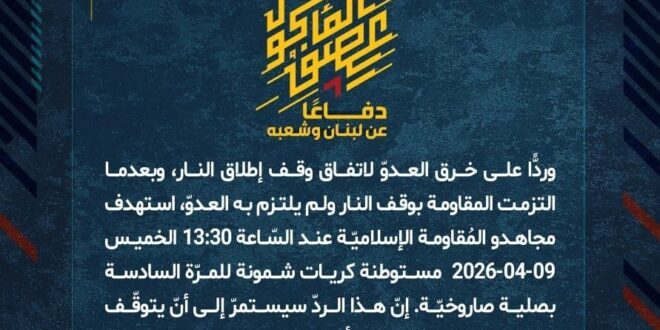 دفاعًا عن لبنان وشعبه، وردًّا على خرق العدوّ لاتفاق وقف إطلاق النار، وبعدما التزمت المقاومة بوقف النار ولم يلتزم به العدوّ، استهدف مجاهدو المُقاومة الإسلاميّة عند السّاعة 13:30 الخميس 09-04-2026 مستوطنة كريات شمونة للمرّة السادسة بصلية صاروخيّة.