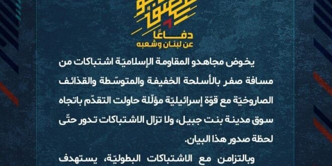 يخوض مجاهدو المقاومة الإسلاميّة اشتباكات بطوليّة من مسافة صفر بالأسلحة الخفيفة والمتوسّطة والقذائف الصاروخيّة مع قوّة إسرائيليّة مؤلّلة حاولت التقدّم باتجاه سوق مدينة بنت جبيل ولا تزال الإشتباكات مستمرّة حتّى لحظة صدور هذا البيان. وبالتزامن مع الاشتباكات البطوليّة، يستهدف مجاهدو المُقاومة الإسلاميّة تجمّعات لآليات وجنود جيش العدوّ الإسرائيليّ في محيط مجمّع موسى عبّاس ومثلّث التحرير والمهنيّة في مدينة بنت جبيل، بصليات صاروخيّة ورمايات مدفعيّة.