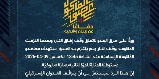 دفاعًا عن لبنان وشعبه، وردًّا على خرق العدوّ لاتفاق وقف إطلاق النار، وبعدما التزمت المقاومة بوقف النار ولم يلتزم به العدوّ، استهدف مجاهدو المُقاومة الإسلاميّة عند السّاعة 13:45 الخميس 09-04-2026 مستوطنة المنارة للمرّة الثانية بصليّة صاروخيّة.