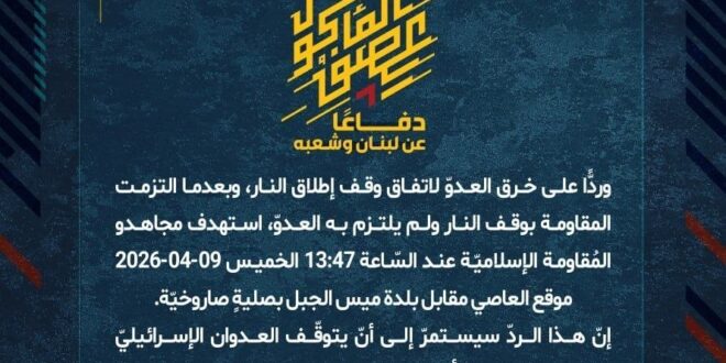 دفاعًا عن لبنان وشعبه، وردًّا على خرق العدوّ لاتفاق وقف إطلاق النار، وبعدما التزمت المقاومة بوقف النار ولم يلتزم به العدوّ، استهدف مجاهدو المُقاومة الإسلاميّة عند السّاعة 13:47 الخميس 09-04-2026 موقع العاصي مقابل بلدة ميس الجبل بصليةٍ صاروخيّة.