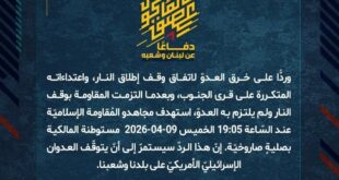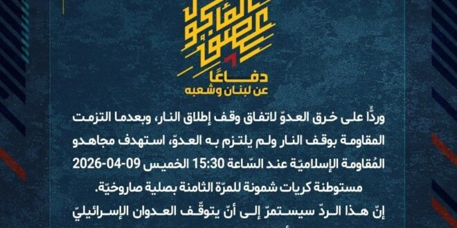 دفاعًا عن لبنان وشعبه، وردًّا على خرق العدوّ لاتفاق وقف إطلاق النار، وبعدما التزمت المقاومة بوقف النار ولم يلتزم به العدوّ، استهدف مجاهدو المُقاومة الإسلاميّة عند السّاعة 15:30 الخميس 09-04-2026 مستوطنة كريات شمونة للمرّة الثامنة بصلية صاروخيّة.