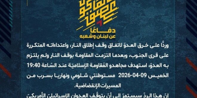 دفاعًا عن لبنان وشعبه، وردًّا على خرق العدوّ لاتفاق وقف إطلاق النار، واعتداءاته المتكررة على قرى الجنوب، وبعدما التزمت المقاومة بوقف النار ولم يلتزم به العدوّ، استهدف مجاهدو المُقاومة الإسلاميّة عند السّاعة 19:40 الخميس 09-04-2026 مستوطنتي شلومي ونهاريا بسرب من المسيرات الإنقضاضية.