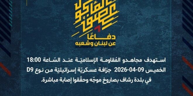 دفاعًا عن لبنان وشعبه، استهدف مجاهدو المُقاومة الإسلاميّة عند السّاعة 18:00 الخميس 09-04-2026 جرّافة عسكريّة إسرائيليّة من نوع D9 في بلدة رشاف بصاروخ موجّه وحقّقوا إصابة مباشرة.