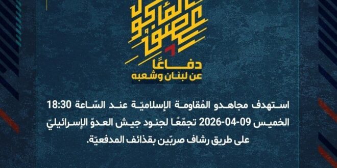 دفاعًا عن لبنان وشعبه، استهدف مجاهدو المُقاومة الإسلاميّة عند السّاعة 18:30 الخميس 09-04-2026 تجمّعًا لجنود جيش العدوّ الإسرائيليّ على طريق رشاف صربّين بقذائف المدفعيّة.