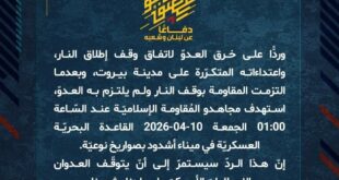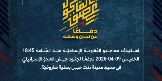 دفاعًا عن لبنان وشعبه، استهدف مجاهدو المُقاومة الإسلاميّة عند السّاعة 18:45 الخميس 09-04-2026 تجمّعًا لجنود جيش العدوّ الإسرائيليّ في محيط مدينة بنت جبيل بصلية صاروخيّة.