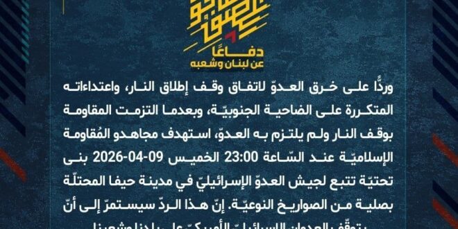 دفاعًا عن لبنان وشعبه، وردًّا على خرق العدوّ لاتفاق وقف إطلاق النار، واعتداءاته المتكررة على الضاحية الجنوبيّة، وبعدما التزمت المقاومة بوقف النار ولم يلتزم به العدوّ، استهدف مجاهدو المُقاومة الإسلاميّة عند السّاعة 23:00 الخميس 09-04-2026 بنى تحتيّة تتبع لجيش العدوّ الإسرائيليّ في مدينة حيفا المحتلّة بصلية من الصواريخ النوعيّة.