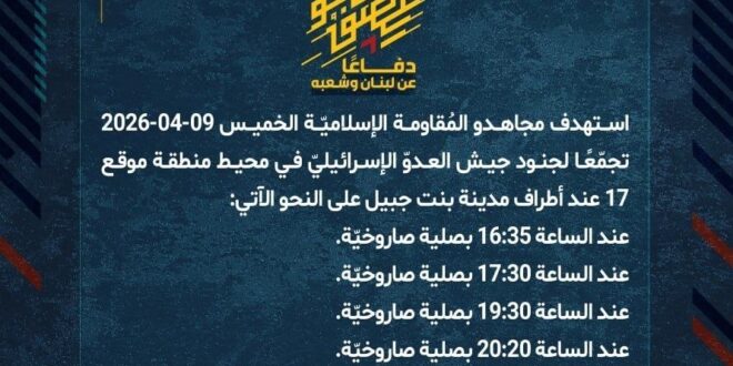 دفاعًا عن لبنان وشعبه، استهدف مجاهدو المُقاومة الإسلاميّة الخميس 09-04-2026 تجمّعًا لجنود جيش العدوّ الإسرائيليّ في محيط منطقة موقع 17 عند أطراف مدينة بنت جبيل على النحو الآتي: