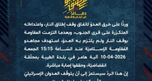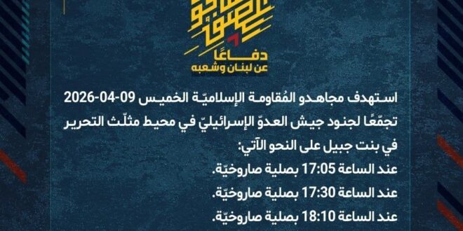 دفاعًا عن لبنان وشعبه، استهدف مجاهدو المُقاومة الإسلاميّة الخميس 09-04-2026 تجمّعًا لجنود جيش العدوّ الإسرائيليّ في محيط مثلّث التحرير عند أطراف مدينة بنت جبيل على النحو الآتي:
