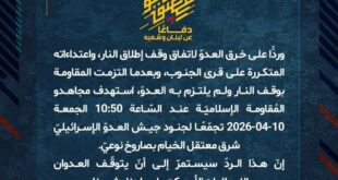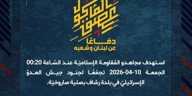 دفاعًا عن لبنان وشعبه، استهدف مجاهدو المُقاومة الإسلاميّة عند السّاعة 00:20 الجمعة 10-04-2026 تجمّعًا لجنود جيش العدوّ الإسرائيليّ في بلدة رشاف بصلية صاروخيّة.