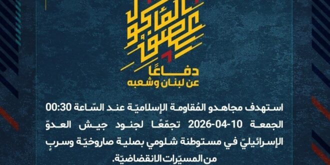 دفاعًا عن لبنان وشعبه، استهدف مجاهدو المُقاومة الإسلاميّة عند السّاعة 00:30 الجمعة 10-04-2026 تجمّعًا لجنود جيش العدوّ الإسرائيليّ في مستوطنة شلومي بصلية صاروخيّة وسربٍ من المسيّرات الانقضاضيّة.