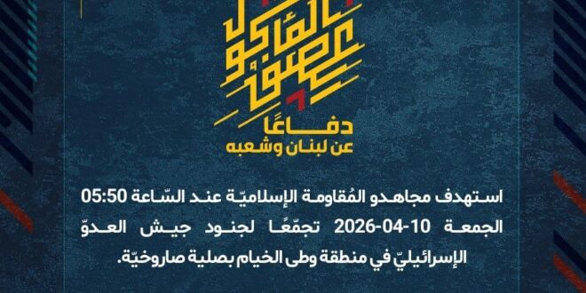 دفاعًا عن لبنان وشعبه، استهدف مجاهدو المُقاومة الإسلاميّة عند السّاعة 05:50 الجمعة 10-04-2026 تجمّعًا لجنود جيش العدوّ الإسرائيليّ في منطقة وطى الخيام بصلية صاروخيّة.