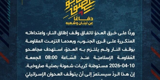 دفاعًا عن لبنان وشعبه، وردًّا على خرق العدوّ لاتفاق وقف إطلاق النار، واعتداءاته المتكررة على قرى الجنوب، وبعدما التزمت المقاومة بوقف النار ولم يلتزم به العدوّ، استهدف مجاهدو المُقاومة الإسلاميّة عند السّاعة 08:00 الجمعة 10-04-2026 مستوطنة كريات شمونة بصلية صاروخية.