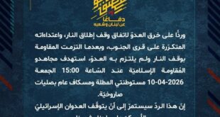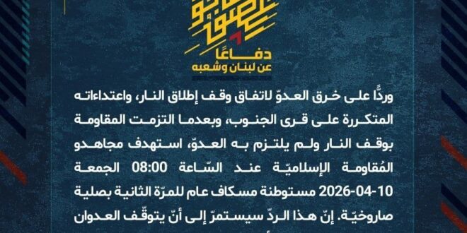 دفاعًا عن لبنان وشعبه، وردًّا على خرق العدوّ لاتفاق وقف إطلاق النار، واعتداءاته المتكررة على قرى الجنوب، وبعدما التزمت المقاومة بوقف النار ولم يلتزم به العدوّ، استهدف مجاهدو المُقاومة الإسلاميّة عند السّاعة 08:00 الجمعة 10-04-2026 مستوطنة مسكاف عام للمرّة الثانية بصلية صاروخيّة.