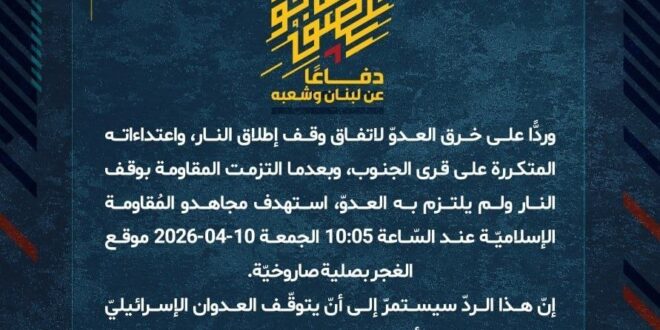 دفاعًا عن لبنان وشعبه، وردًّا على خرق العدوّ لاتفاق وقف إطلاق النار، واعتداءاته المتكررة على قرى الجنوب، وبعدما التزمت المقاومة بوقف النار ولم يلتزم به العدوّ، استهدف مجاهدو المُقاومة الإسلاميّة عند السّاعة 10:05 الجمعة 10-04-2026 موقع الغجر بصلية صاروخيّة.