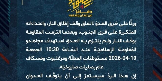دفاعًا عن لبنان وشعبه، وردًّا على خرق العدوّ لاتفاق وقف إطلاق النار، واعتداءاته المتكررة على قرى الجنوب، وبعدما التزمت المقاومة بوقف النار ولم يلتزم به العدوّ، استهدف مجاهدو المُقاومة الإسلاميّة عند السّاعة 10:30 الجمعة 10-04-2026 مستوطنات المطلّة ومرغليوت ومسكاف عام بصليات صاروخيّة.